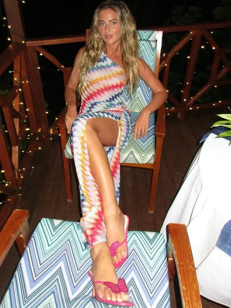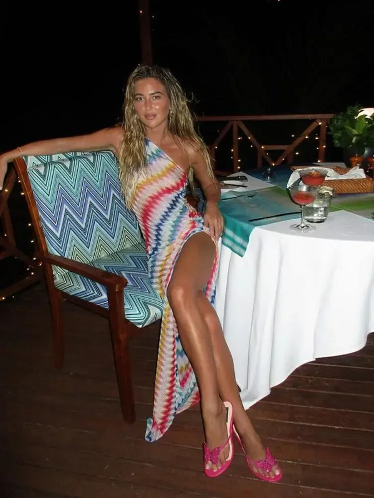 Bunt gestreiftes Schrägschulterkleid mit Schlitz